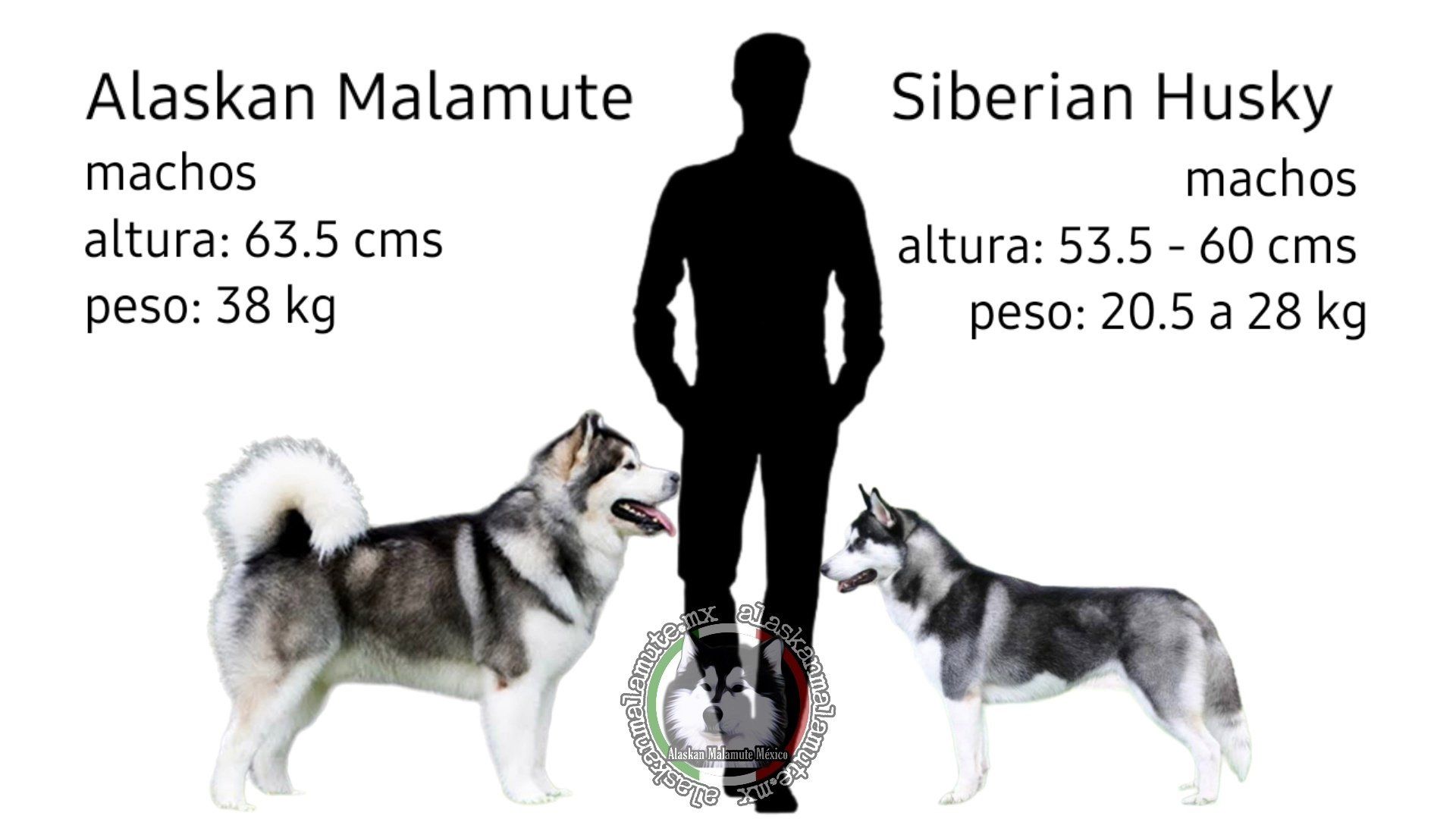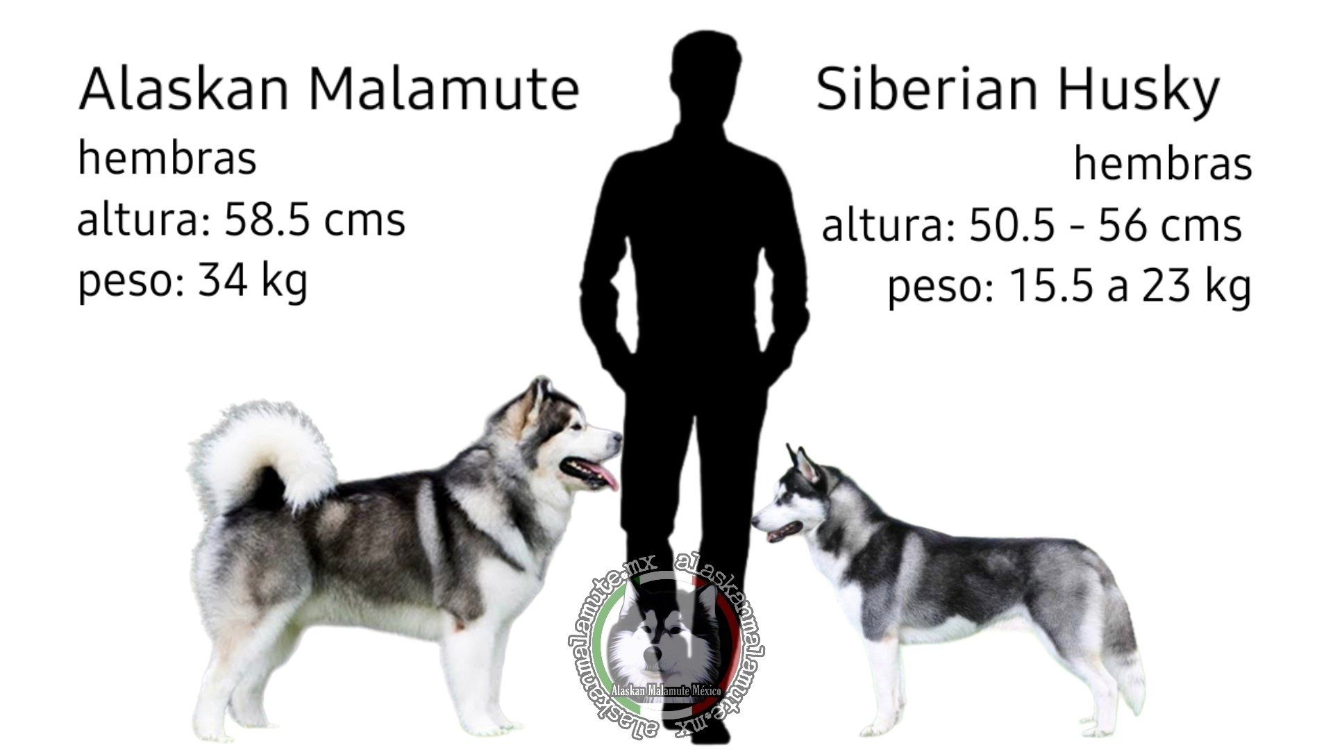 El estándar del Alaskan Malamute no señala un rango estricto de altura y peso, lo más importante son las proporciones, a diferencia del Siberian Husky en cuyo caso, si un ejemplar rebasa los rangos de tamaño es considerado como una falta eliminatoria en competencias.