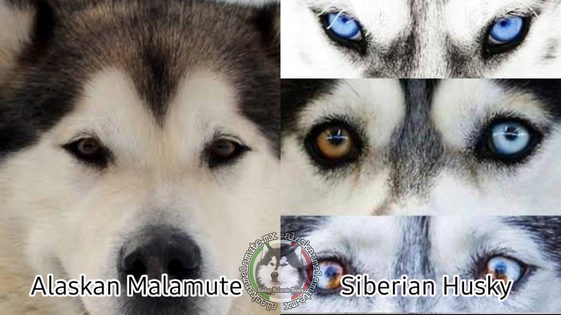 Los ojos de un alaskan Malamute están dispuestos oblicuamente en el cráneo, son medianos, castaños, almendrados y de ningún modo pueden ser de color azul, ya que esto representa una falta eliminatoria en competencias. Pero el siberian Husky los tiene almendrados, moderadamente separados y muy poco oblicuos y admite prácticamente cualquier color, incluso con heterocromia completa o parcial, la cual consiste en que sus ojos sean de colores distintos o incluso distintos colores en un mismo ojo.